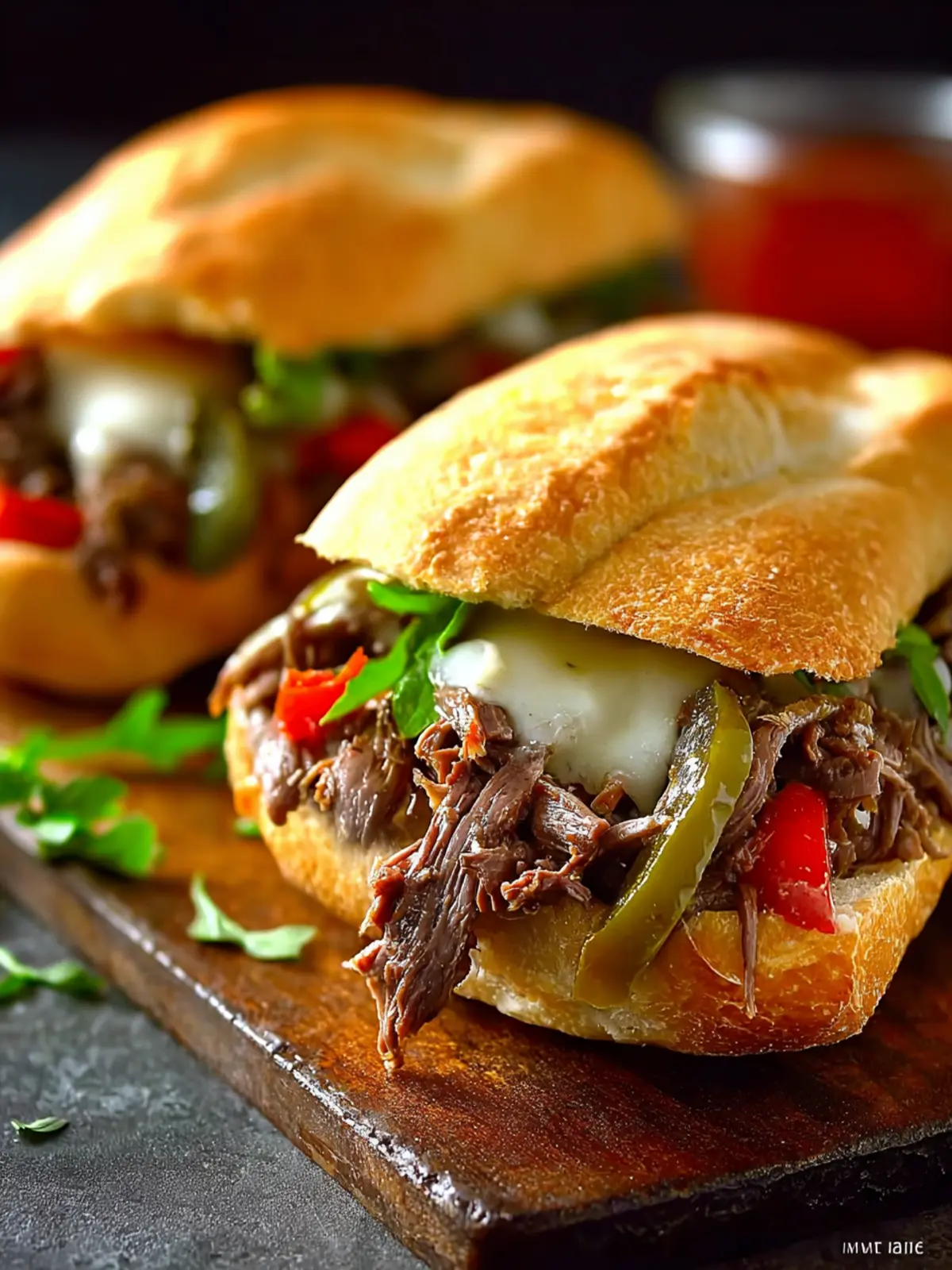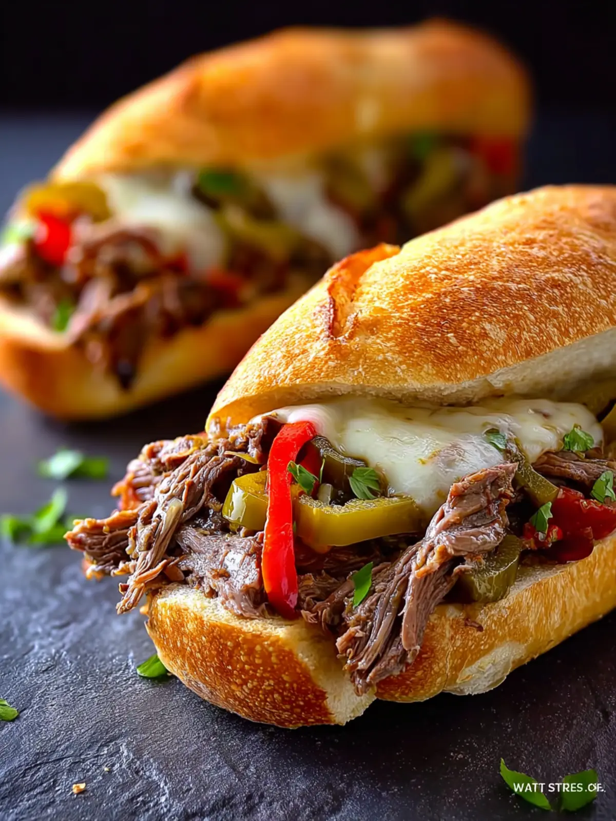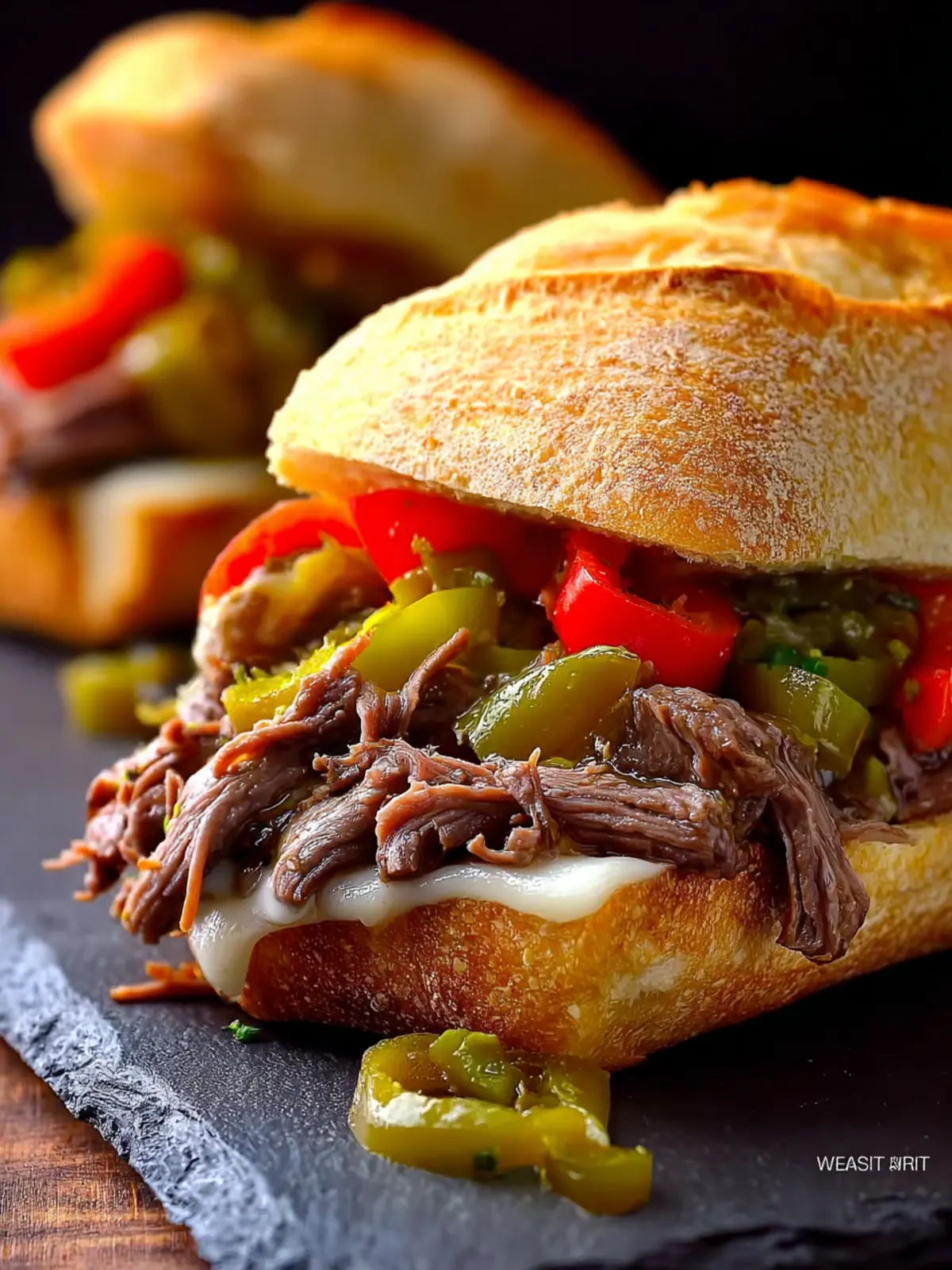 A delicious, slow-cooked Italian beef sandwich made with seasoned chuck roast, peppers, and melted provolone cheese.