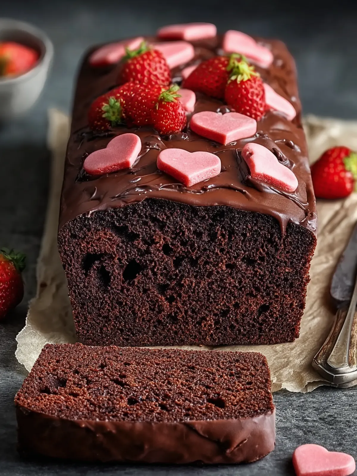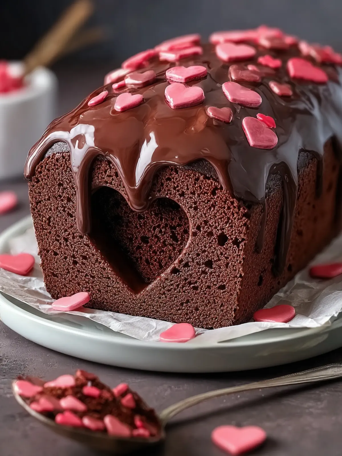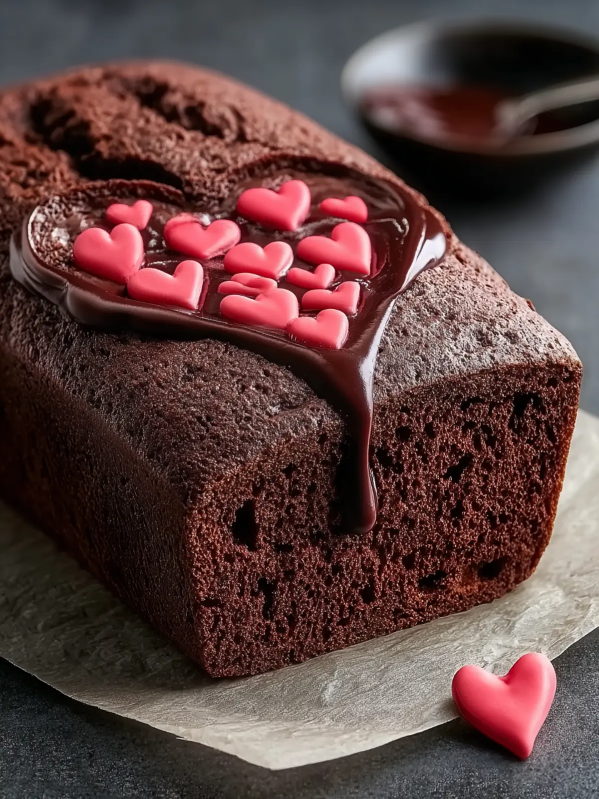 A rich and gooey chocolate loaf cake with hidden heart filling.