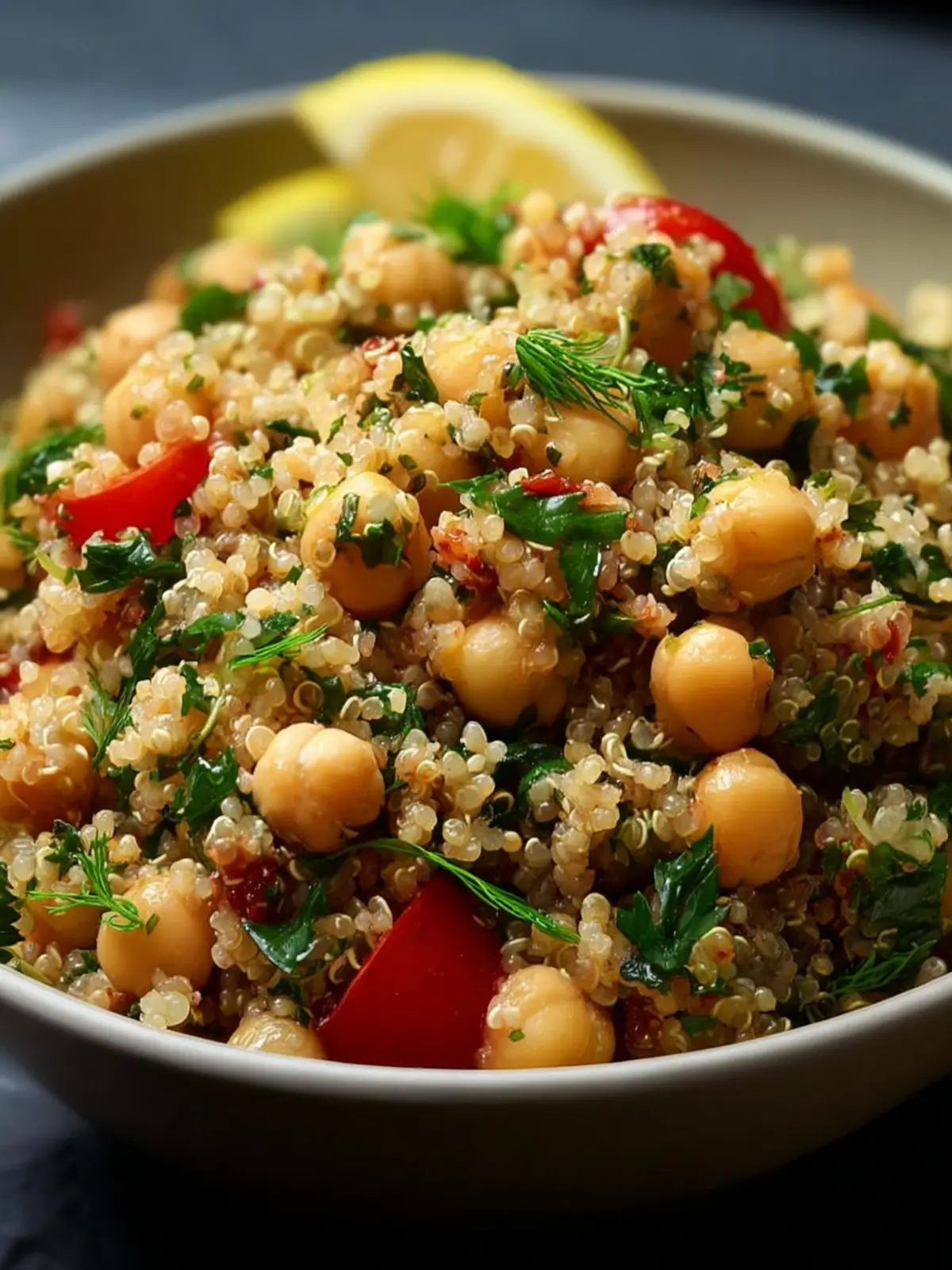 A refreshing and healthy quinoa salad with chickpeas, vegetables, and a lemon vinaigrette.